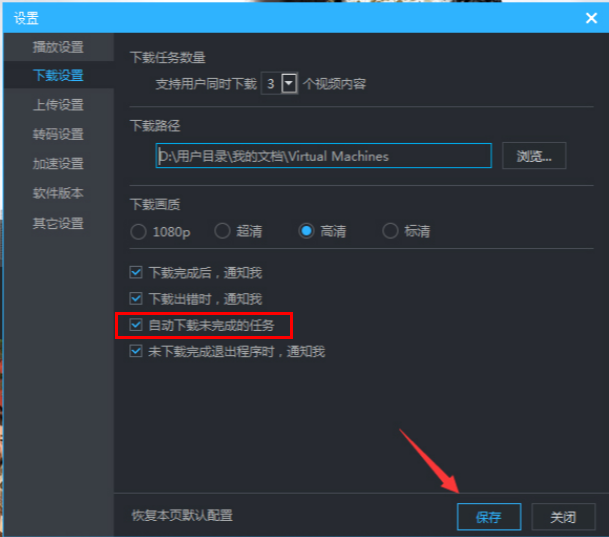 3、然后找到右侧中的"自动下载未完成的任务",将其小方框勾选上,最后点击下方中的"保存"按钮就可以了。