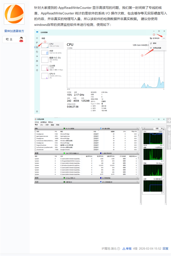 该吧吧主"雷神加速器官方"进一步说明,针对大家提到的AppReadWriteCounter显示高读写的问题,我们第一时间做了专线的核查。