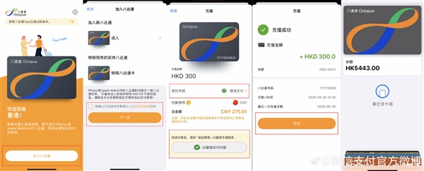 旅客后续可直接在App内使用微信支付进行充值,还可将旅客版八达通添加至iPhone交通卡。