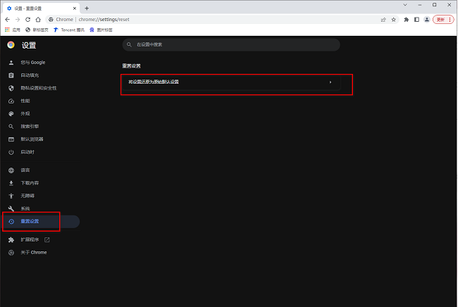 5、如果依然无法解决问题的话,点击左侧栏中的"重置设置"选项,点击右侧中的"将设置还原为原始默认设置"选项。