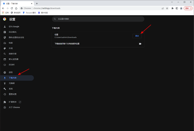 3、进入到新界面后,点击左侧栏中的"下载内容"选项,然后点击右侧中的"更改"按钮。