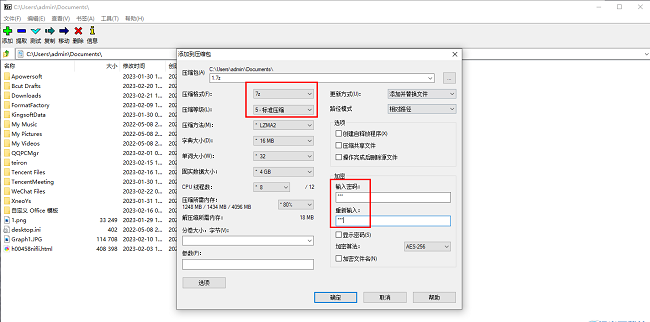 2、在打开的窗口界面中,选择好压缩格式以及压缩等级,并找到"加密"一栏,输入需要设置的密码,然后点击"确定"保存。